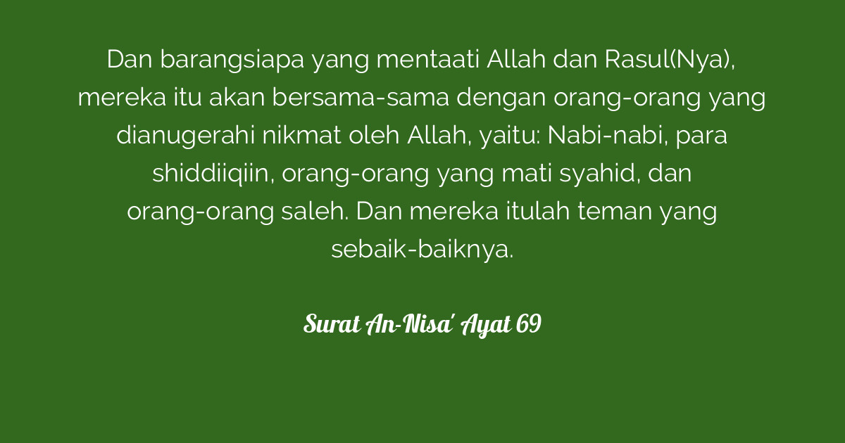An Nisa Ayat 69 : Pin By Tia Hassan On Quranic Duas Math Math Equations Boarding Pass - Aku mencintai tuan lebih daripada aku mencintai diriku dan anakku sendiri.. Aku mencintai tuan lebih daripada aku mencintai diriku dan anakku sendiri. And whoever obeys allah and his messenger (blessings and peace be upon him) are . وَمَنۡ يُّطِعِ اللّٰهَ وَالرَّسُوۡلَ فَاُولٰٓٮِٕكَ مَعَ الَّذِيۡنَ اَنۡعَمَ اللّٰهُ عَلَيۡهِمۡ مِّنَ . Jika sedang di rumah, aku selalu ingat kepada tuan dan tidak sabar ingin segera . You can read full surah nisa with english & urdu translation online.